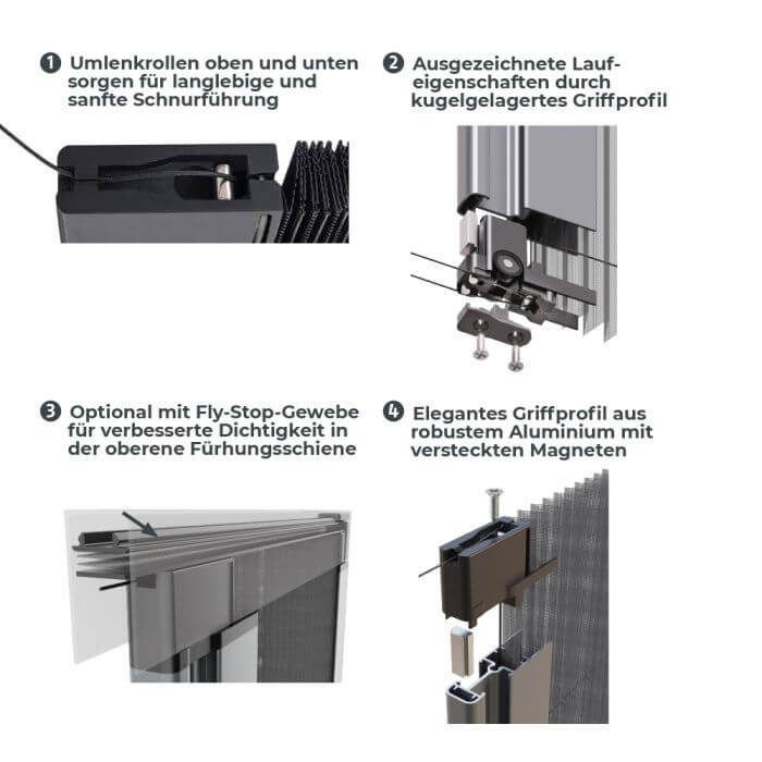 Dieses Plisseefenster überzeugt im täglichen Gebrauch: Es wird bereits voreingestellt geliefert und lässt sich dank Klippsystem besonders schnell und einfach montieren. Der Insektenschutz läuft leichtgängig über eine kugelgelagerte Führung, während eine geschützte Schnurführung durch Umlenkrollen oben und unten für langlebige Funktion sorgt. So öffnen und schließen Sie das Fenster jederzeit problemlos – der Insektenschutz bleibt dabei immer zuverlässig und dezent.
